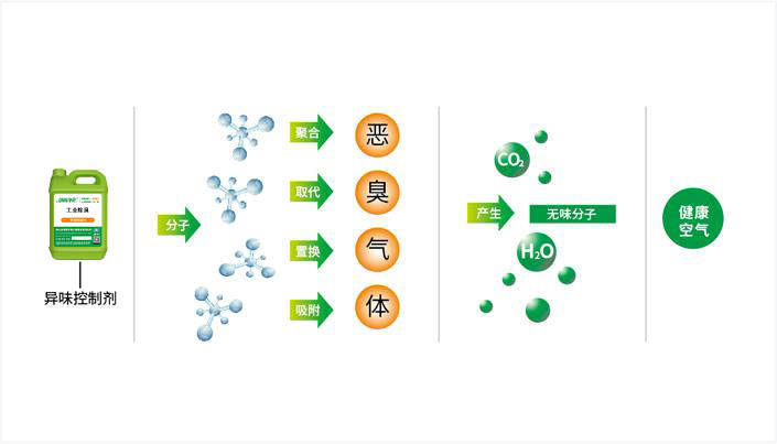 02.中和法新型技術,除臭劑霧化成分子吸附異味分子使之沉降,并氧化生成無毒無味產(chǎn)物,同時保留香氣